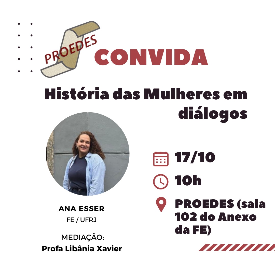 Em mais uma edição do PROEDES Convida, conversaremos com a professora Anna Beatriz Esser, que também faz parte da equipe do PROEDES, sobre o tema “História das Mulheres em Diálogos”. O bate-papo, que será mediado pela professora Libânia Xavier, acontecerá na próxima sexta-feira, dia 17/10, às 10h. Confira as informações na imagem abaixo. Não é necessária inscrição prévia.