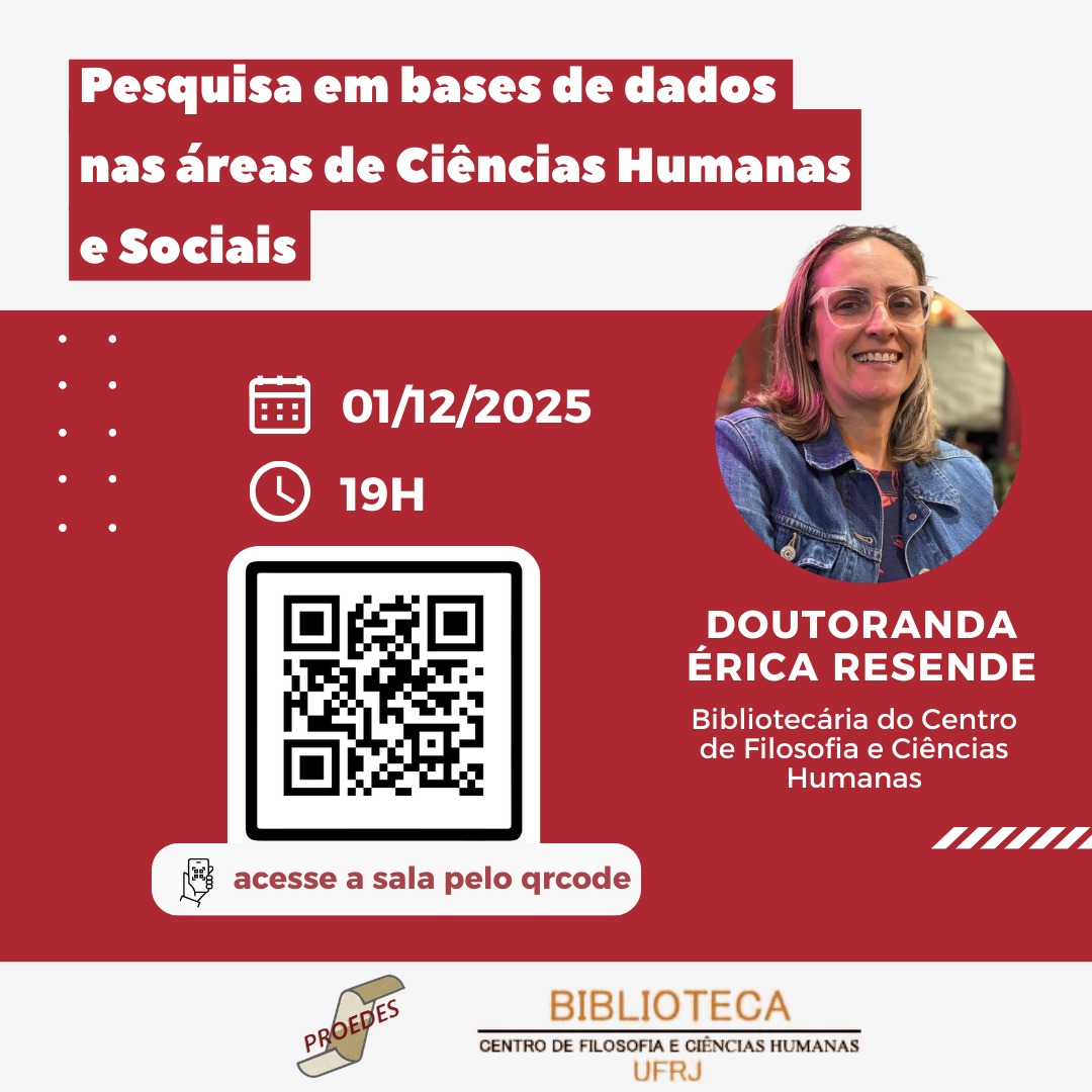 Na próxima segunda-feira, dia 01 de dezembro, às 19h, Érica Resende, doutoranda do PPGE/UFRJ e bibliotecária do CFCH, irá realizar uma formação sobre a “Pesquisa em Bases de Dados nas áreas de Ciências Humanas e Sociais”.